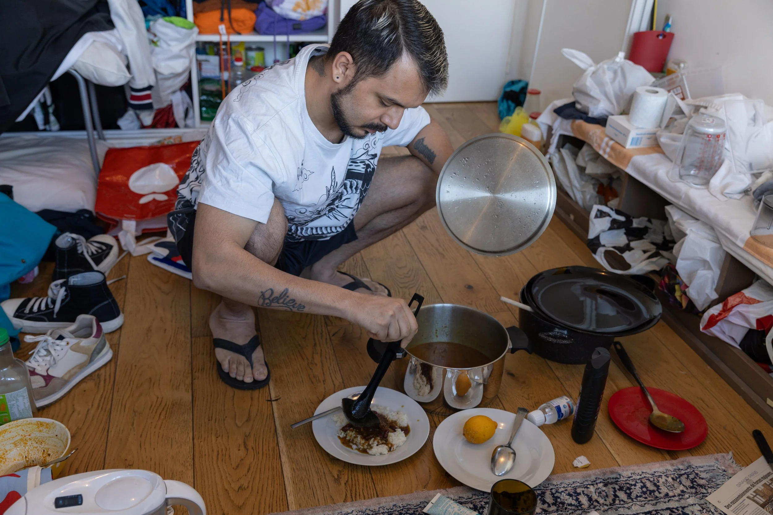 Oscar lived the first two months on the streets. Currently, he lives with 4 other refugees in an apartment. He is serving an Indian dish for breakfast in his room. Paris, 8 April 2023.