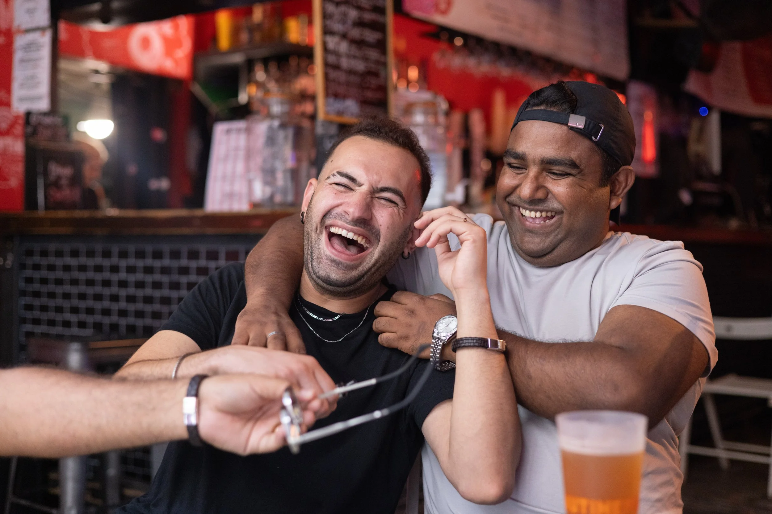 Aslam with friends in a gay bar in Paris. The first time to feel okay to be fully exposed on a photograph. No hiding anymore. Paris, 10 September 2023.