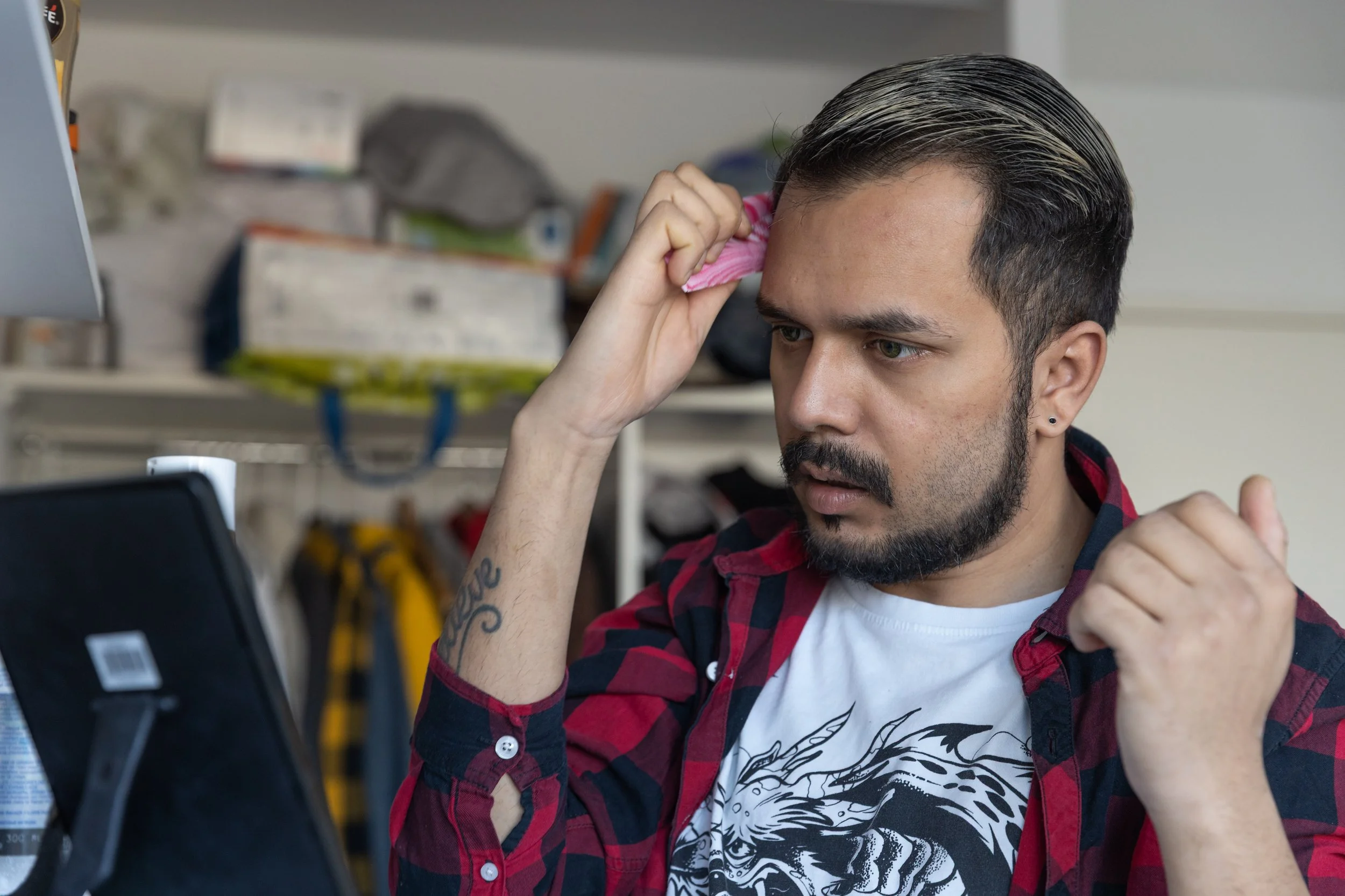 Oscar always takes care of his appearance and present himself well styled. He worked as a fashion stylist in Ukrain. Paris, 8 April 2023.