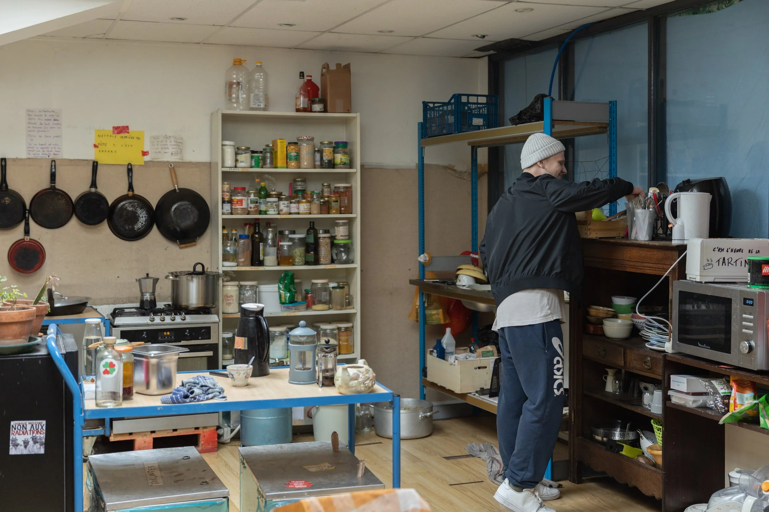 Vlad prepares a tea in the kitchen of the squat. He is happy to be around other people, the question remains: how long can I stay here? Pantin, 8 March 2023.