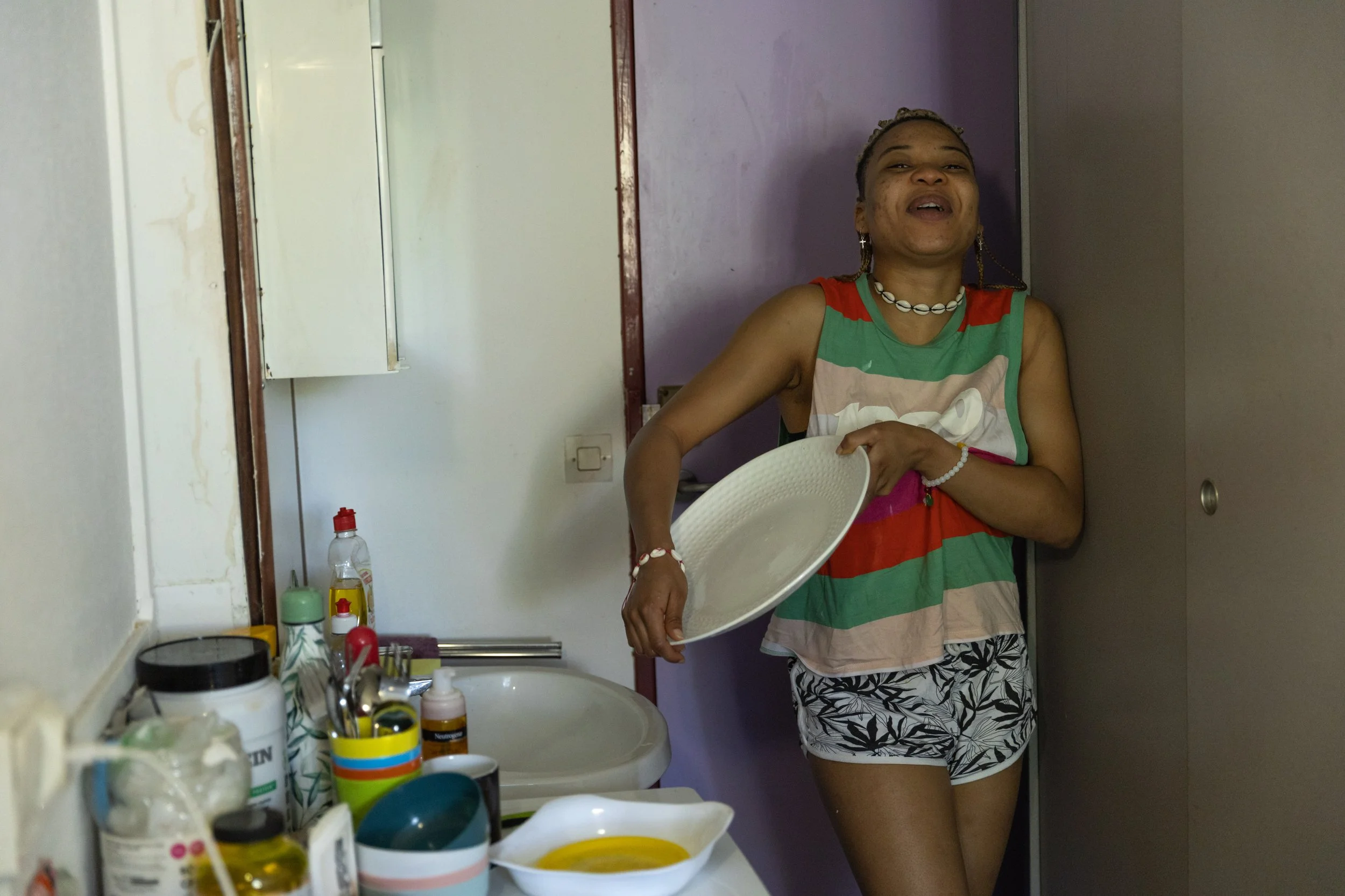 Courage in her room, which is very small. She lives in a large flat where asylum seekers, refugees and pensioners live. Courage keeps striving for her freedom. Fontenay-sous-Bois, 11 March, 2023.