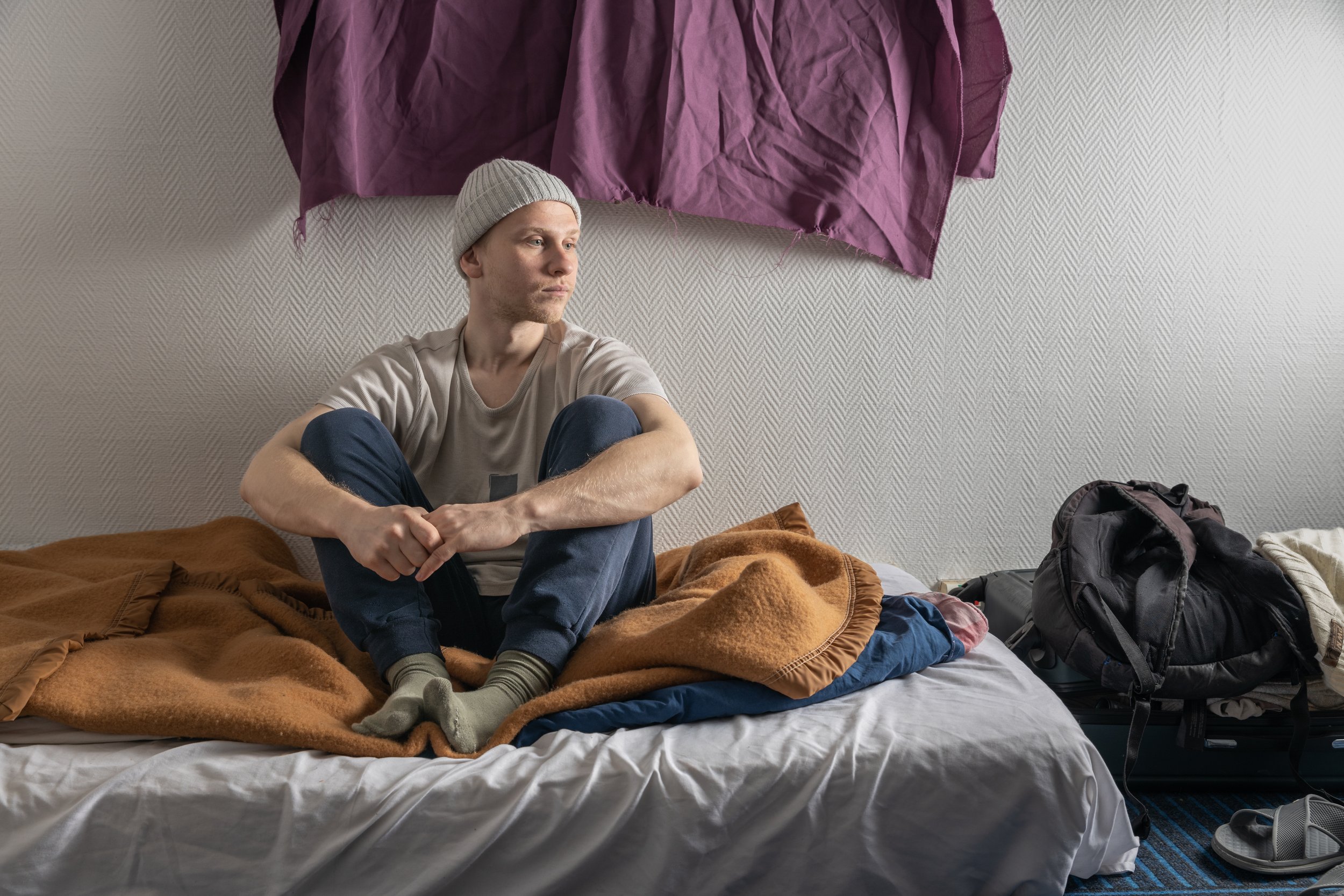 Vlad, 25 years old, from Russia. Vlad arrived in Paris in April 2022 and was sent to a camp in the south of France (Besançon). He returned to Paris. This was his room in a squat. Pantin, 8 March 2023.